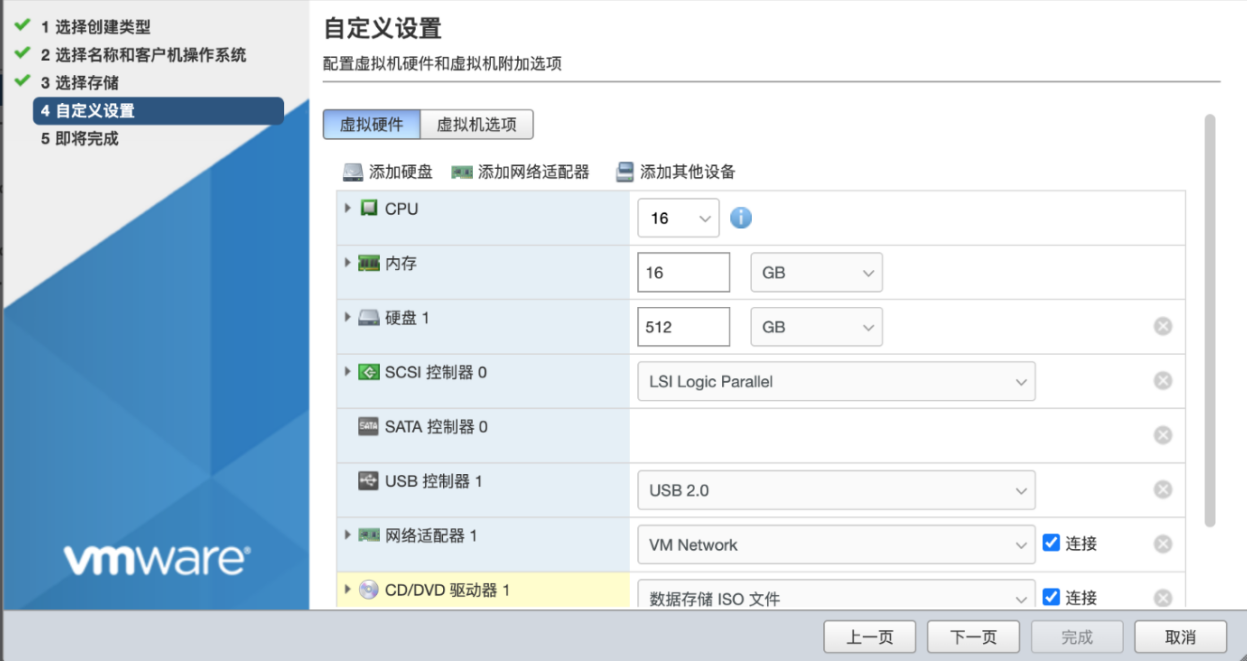 填写资源分配 勾选cd/dvd驱动器,选择数据存储iso文件。