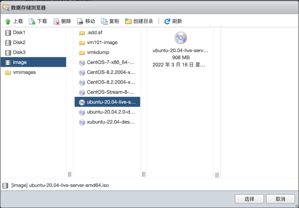 选择镜像 选择ubuntu20.04live版的iso文件,下一页确认各项设置后点击完成,等待虚拟机创建成功提示。